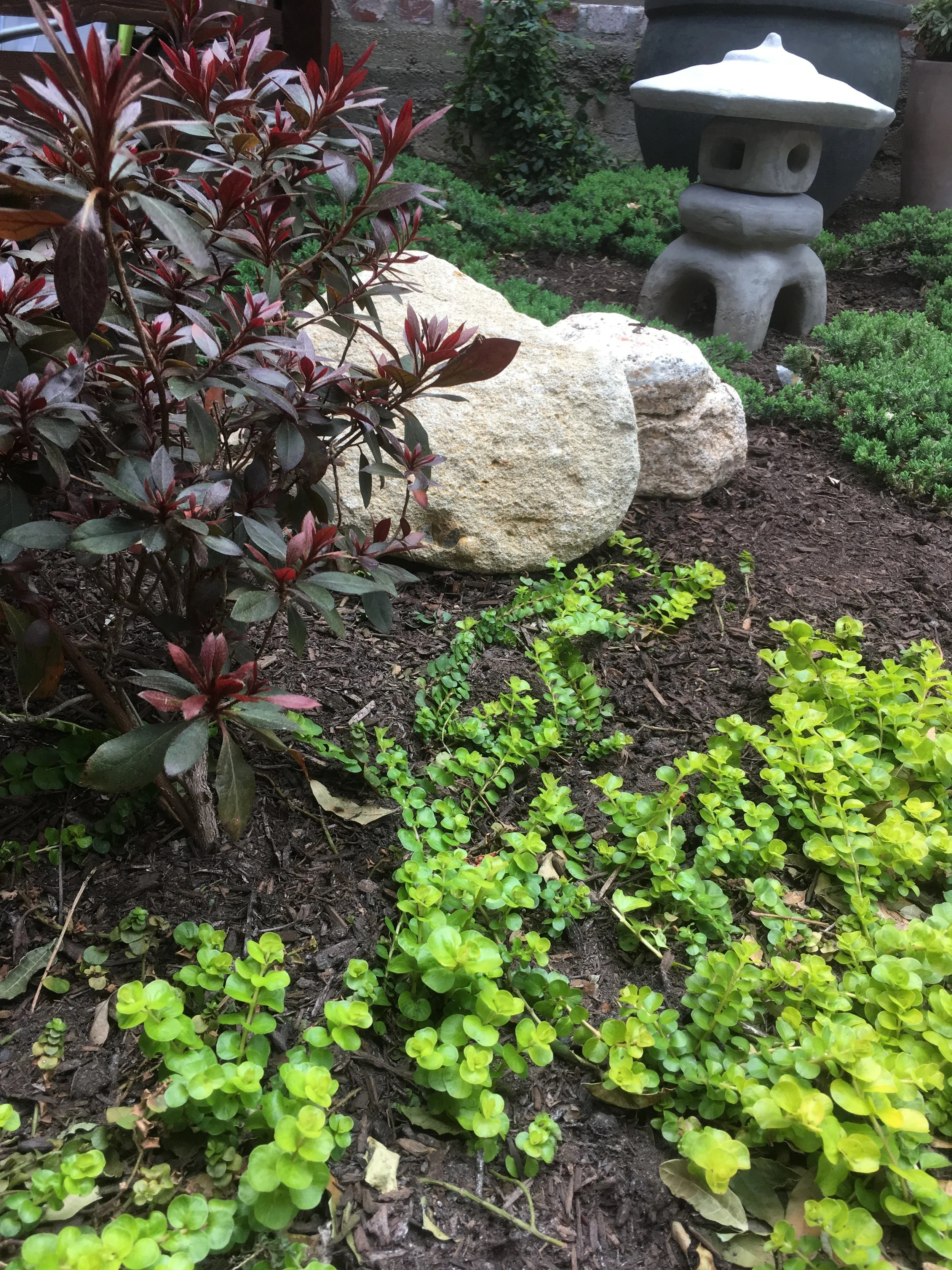 Burgundy azalea and Japanese maple look stately among green Juniper and golden creeping jenny.